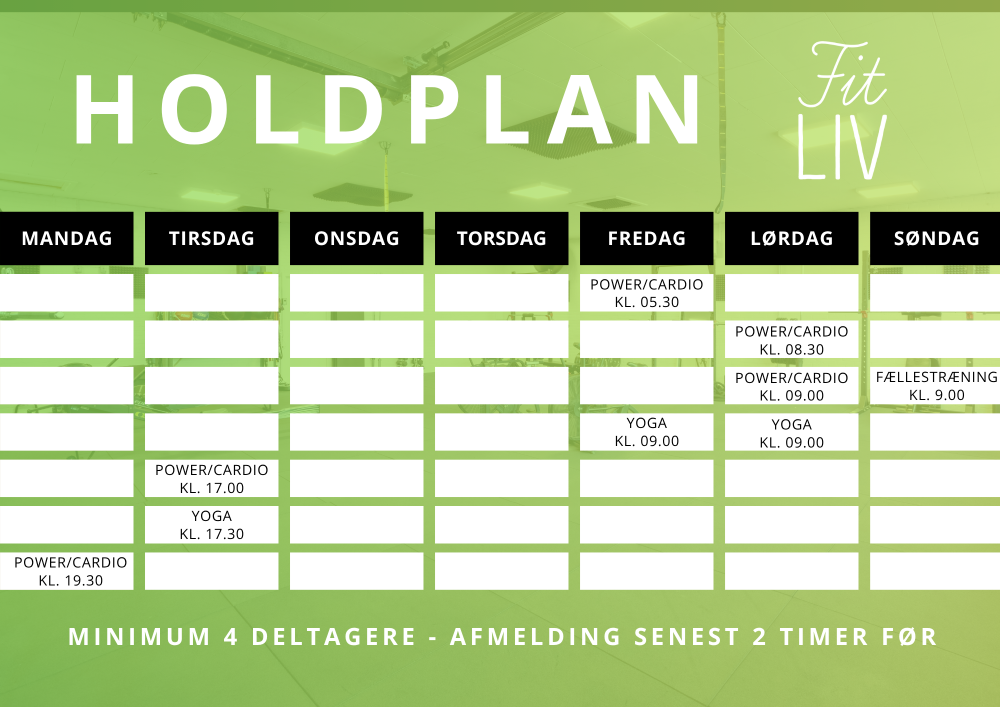 OBS - Ovenstående skema er holdplan for alm. hold. Vi tilbyder også vores bootcamphold hvor du fast går på et hold med samme instruktør som kender dig og dine mål,